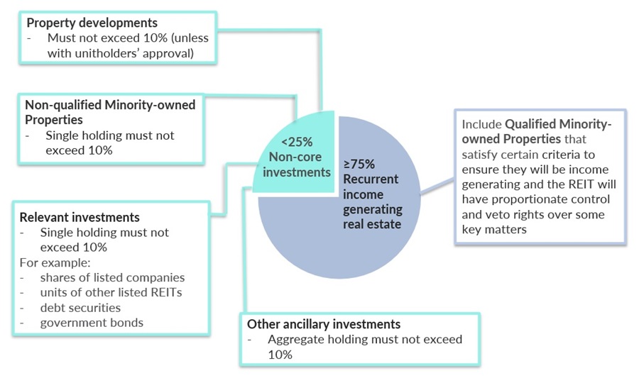 - non-core investments, including investments in property development projects, shall not exceed 25% of a REIT’s gross asset value